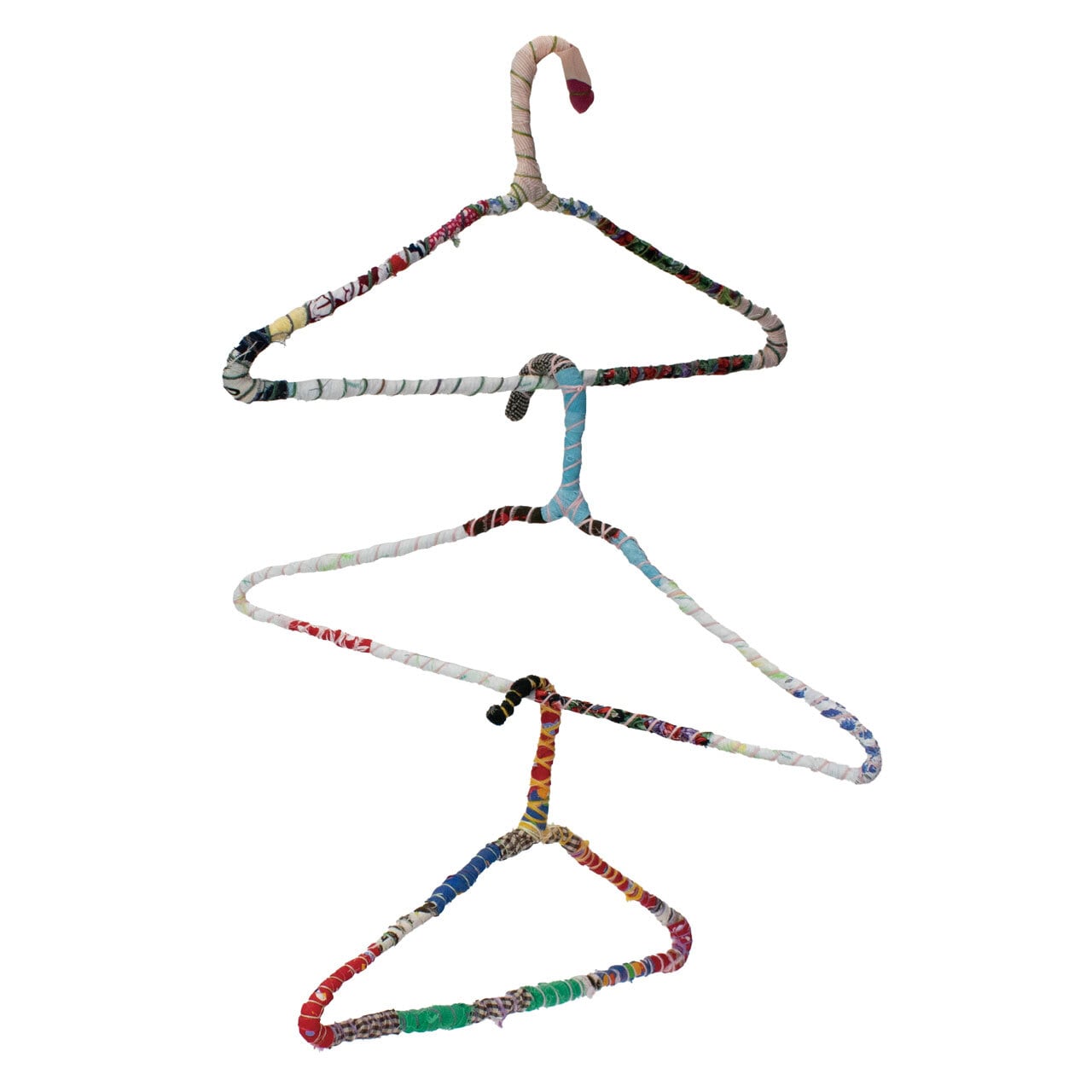 様々な柄の布地を裂いてハンガーに