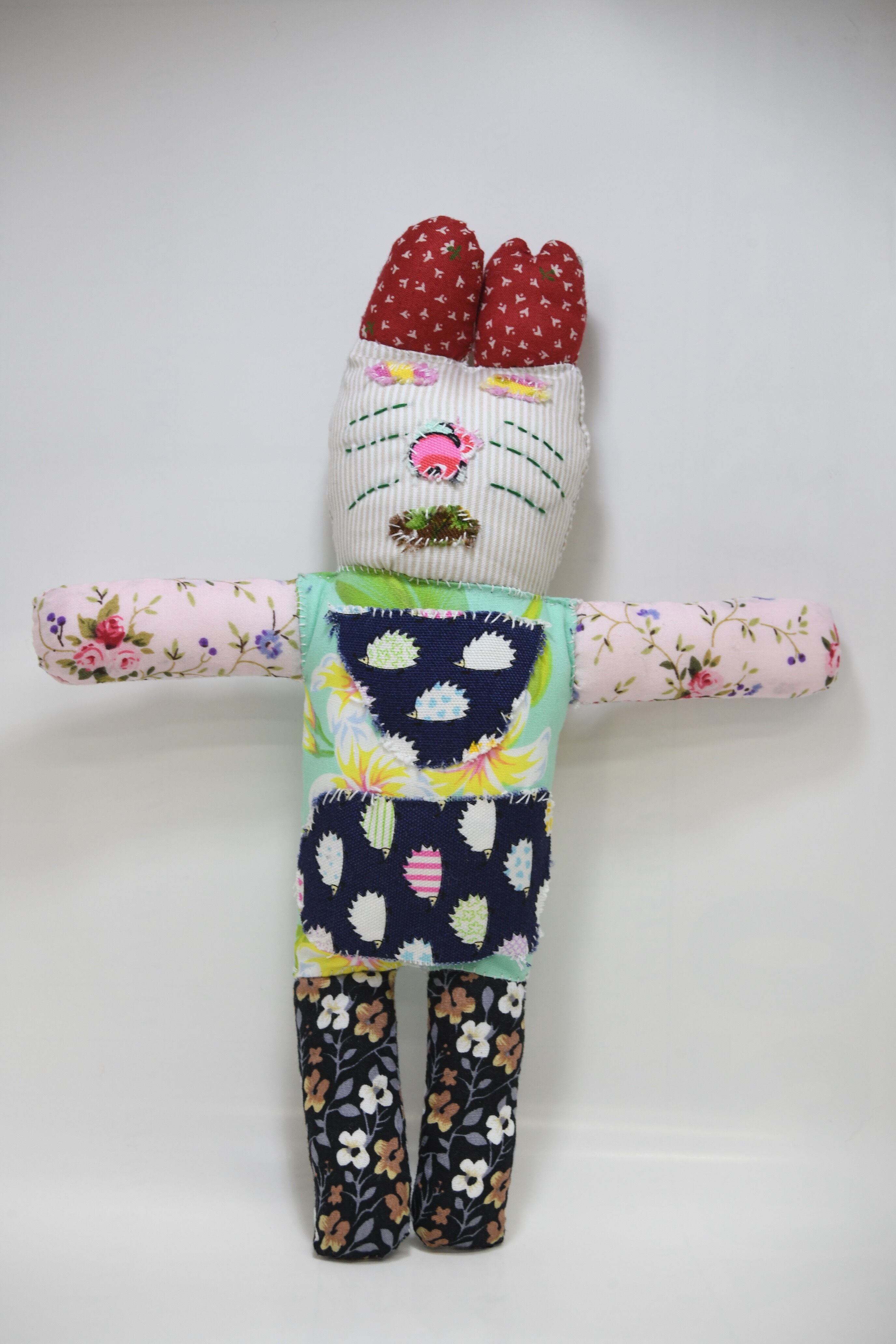 端切れを使い、顔や手足などのパーツごとに布を変えて手縫いで作り上げます。その後、レースやフリルなどをつけたり、ボタンやアクセサリーなどをつけ、洋服を完成させます。
