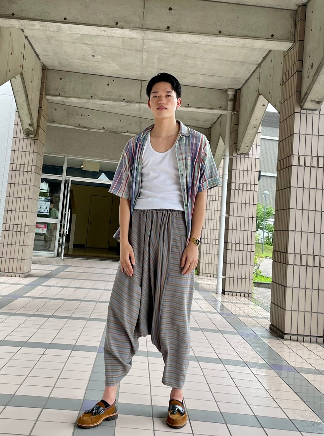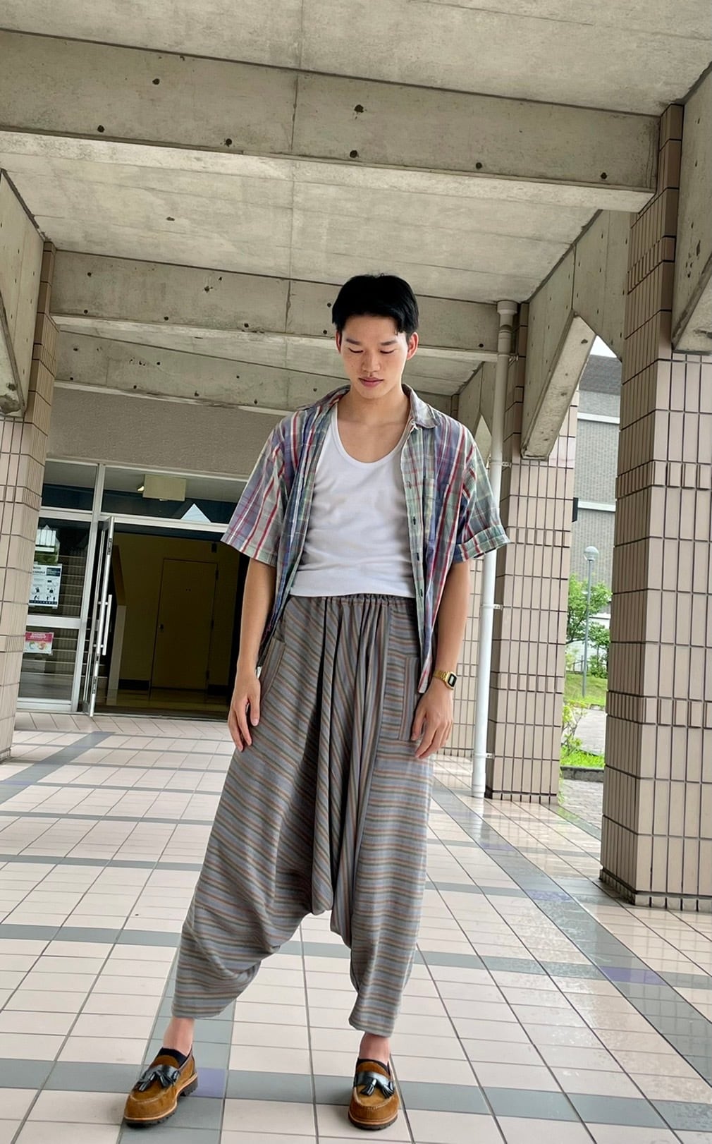 ゆったりと股上が深いパンツ。一般的にはサルエルパンツですが、「おめでたいのふく」では作る際に三角形に近い形で縫い上げるのでさんかくパンツと名付けました。使う生地によって印象が変わるパンツです。とても肌触りのいい絹の着物でつくりました。控えめな色合いなので、合わせやすく着こなしやすい一着です。