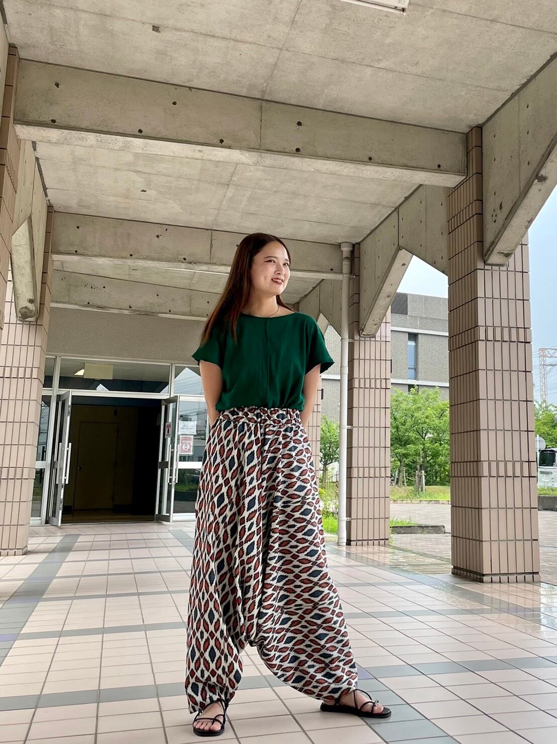 ゆったりと股上が深いパンツ。一般的にはサルエルパンツですが、「おめでたいのふく」では作る際に三角形に近い形で縫い上げるのでさんかくパンツと名付けました。使う生地によって印象が変わるパンツです。ウール地の力強い柄でつくりました。