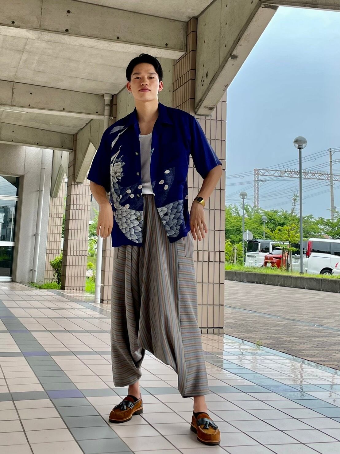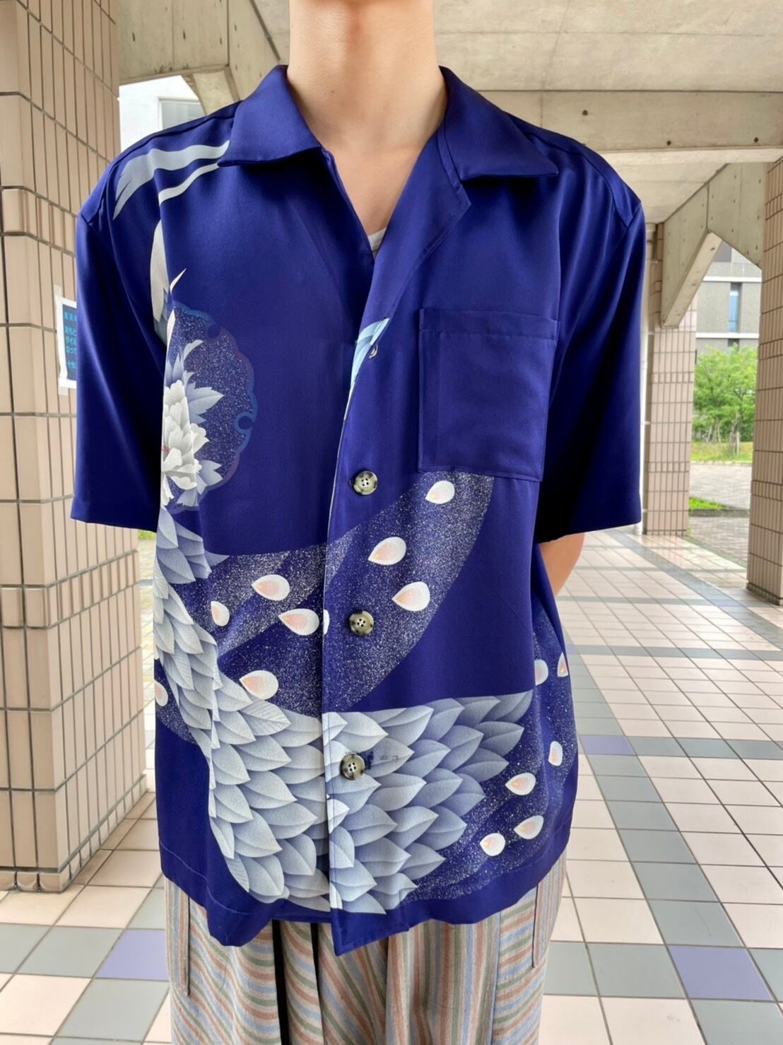 目の覚めるような鮮やかな青色の着物からアロハシャツを作りました。ペアで着ていただいても素敵です。さらっと羽織るだけで決まる1着です。どちらも一点物です。