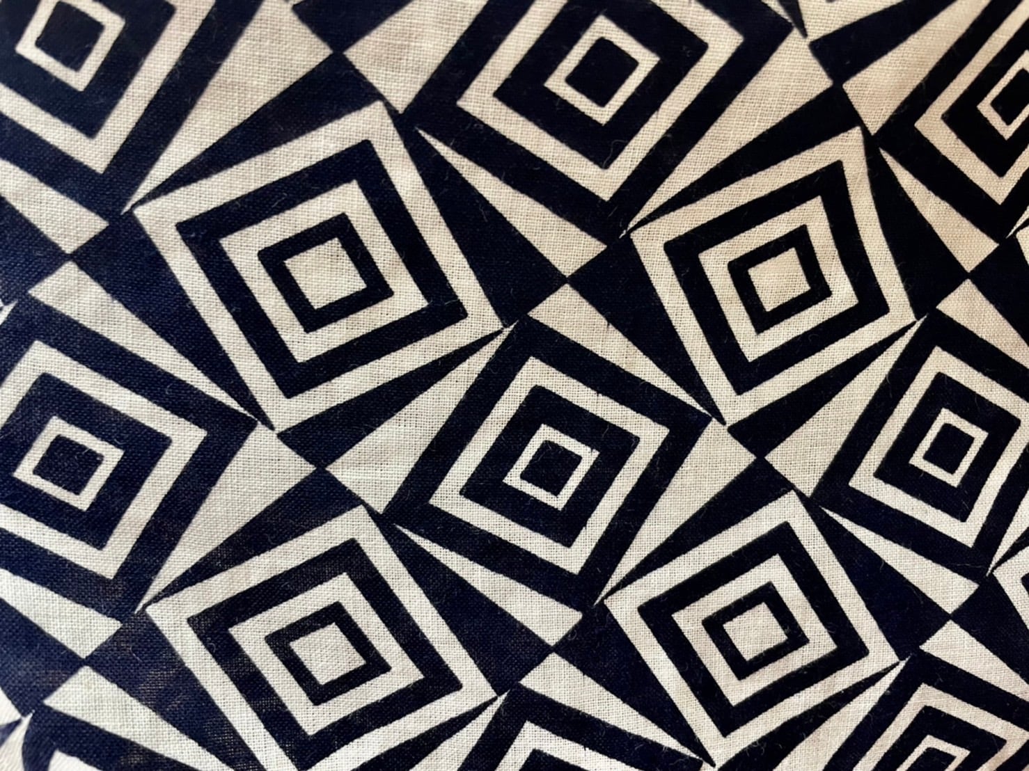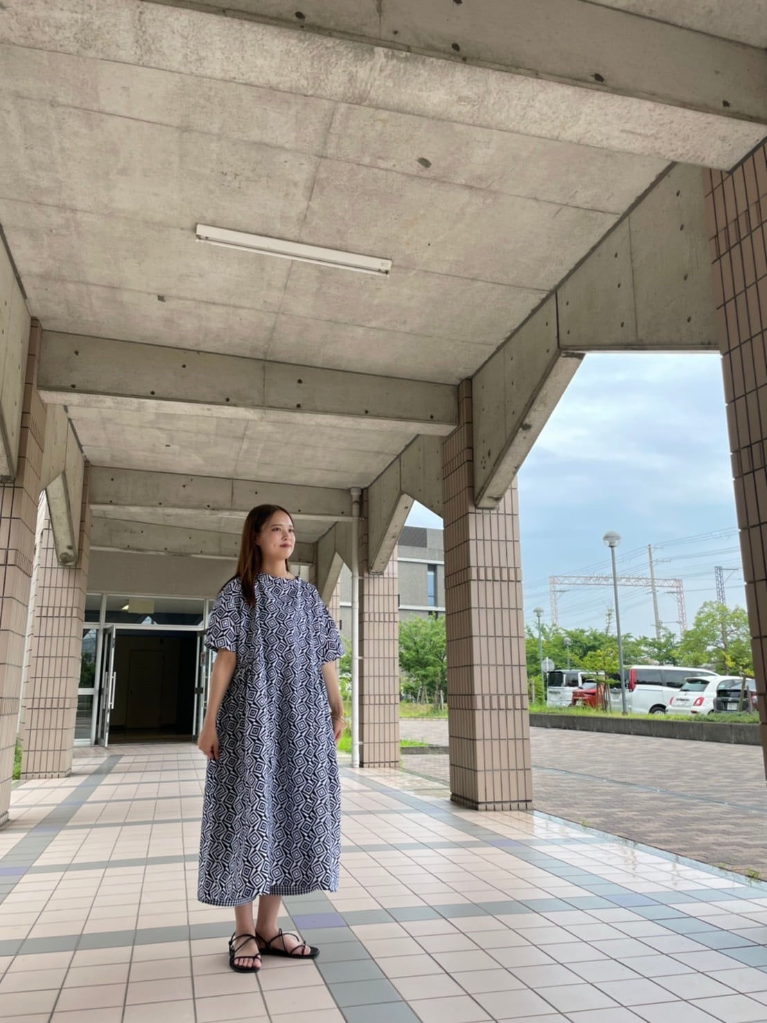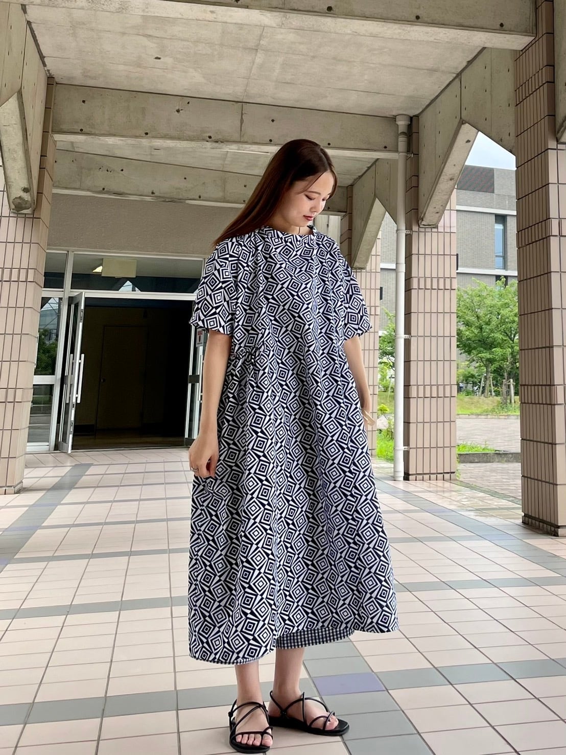 浴衣地できりかえワンピースをつくりました。幾何学模様がレトロです。きりかえ部分にポケットを付けました。ゆったりしたシルエットで、夏に涼しく1枚で着れます。お祭りにもぴったりです。